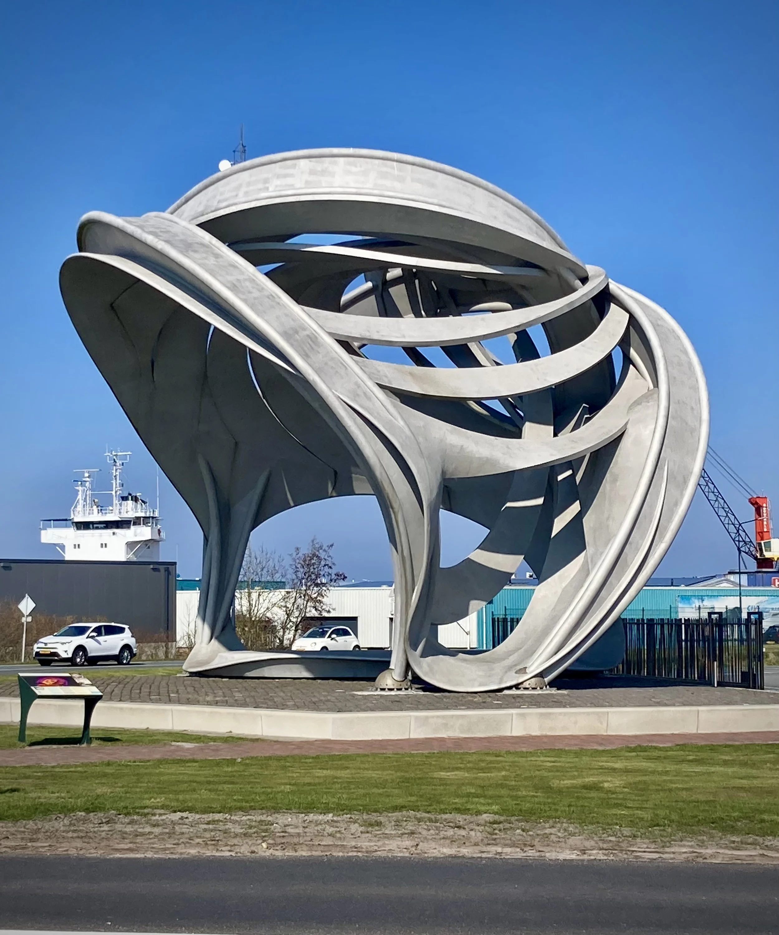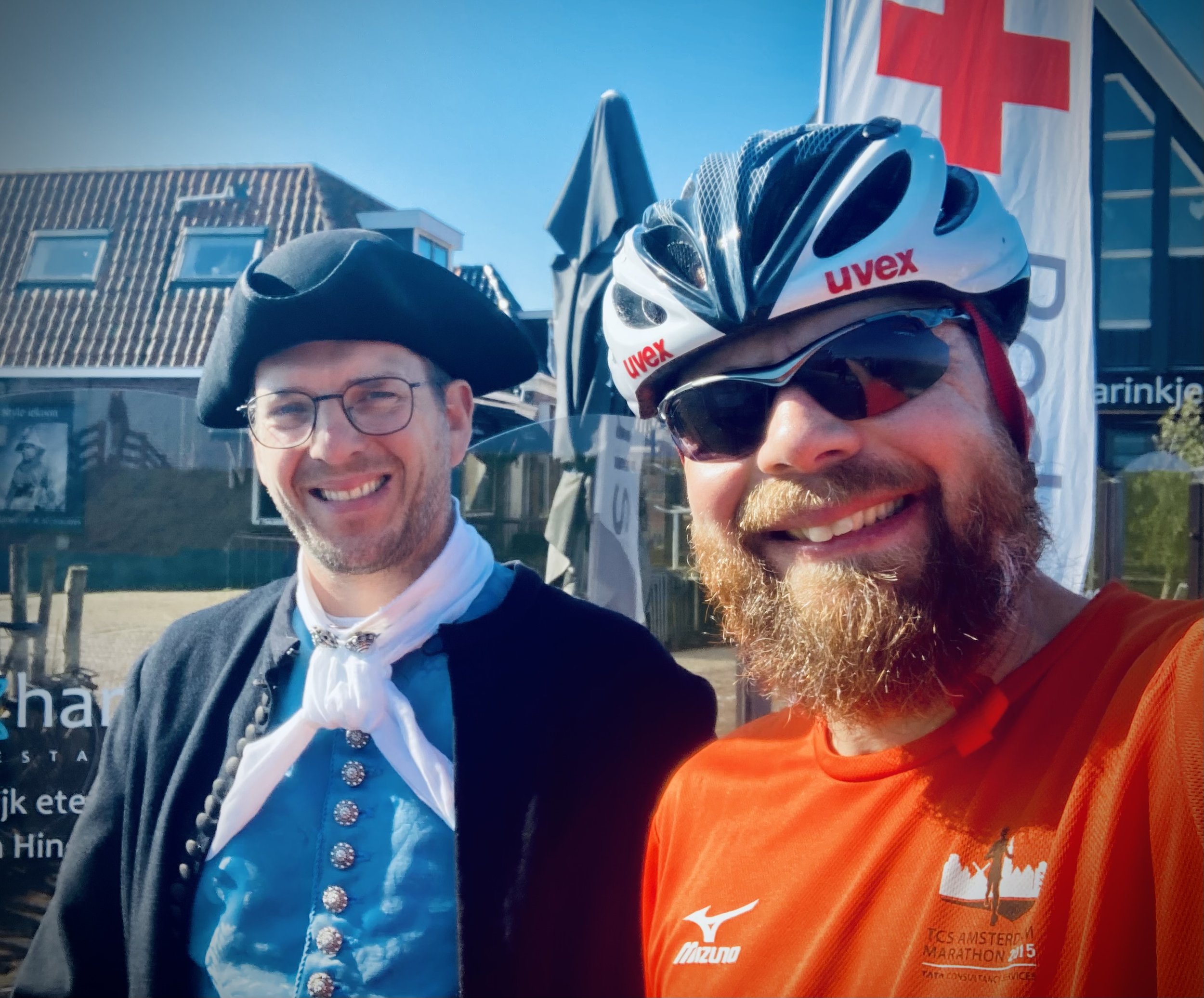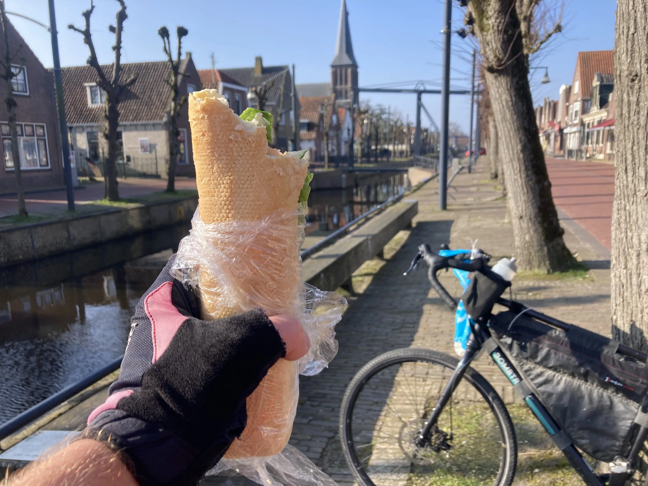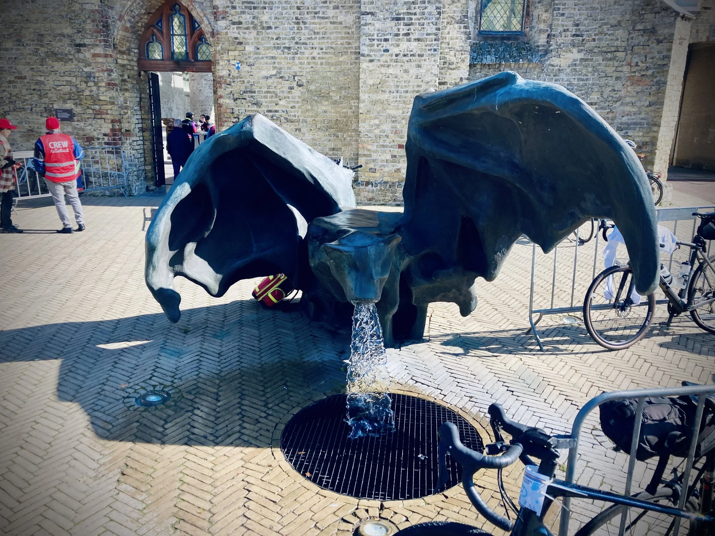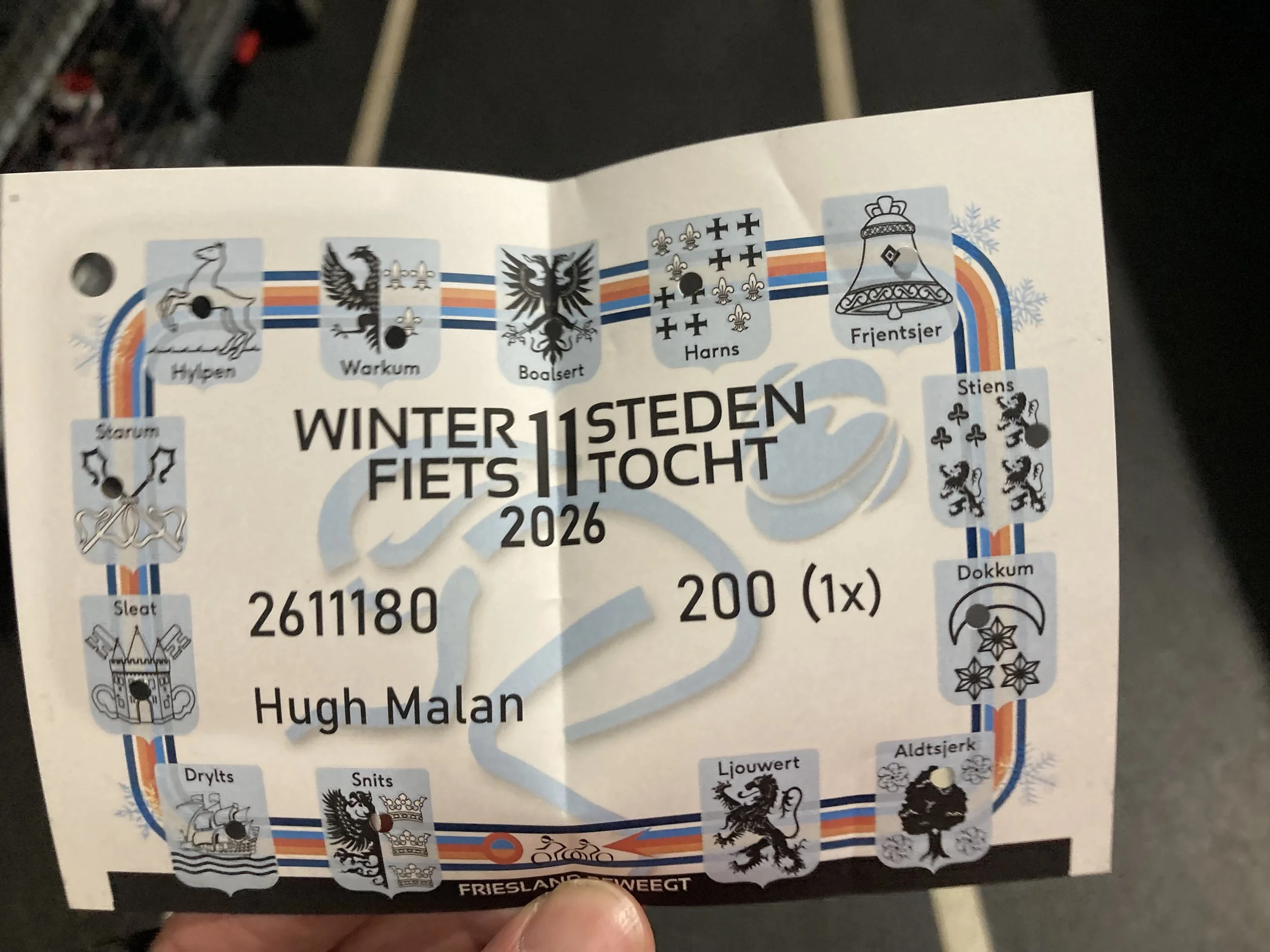 From left to right: I rode the Elfstedentocht two weekends ago; the start was cold and busy. Lunch break at the third or fourth town of the eleven. You got your ticket punched at each town, this person got dressed up for the occasion. Dragon statue at the midday stop. A building so unusual I stopped for a photo. The ticket at the end, all eleven towns complete.