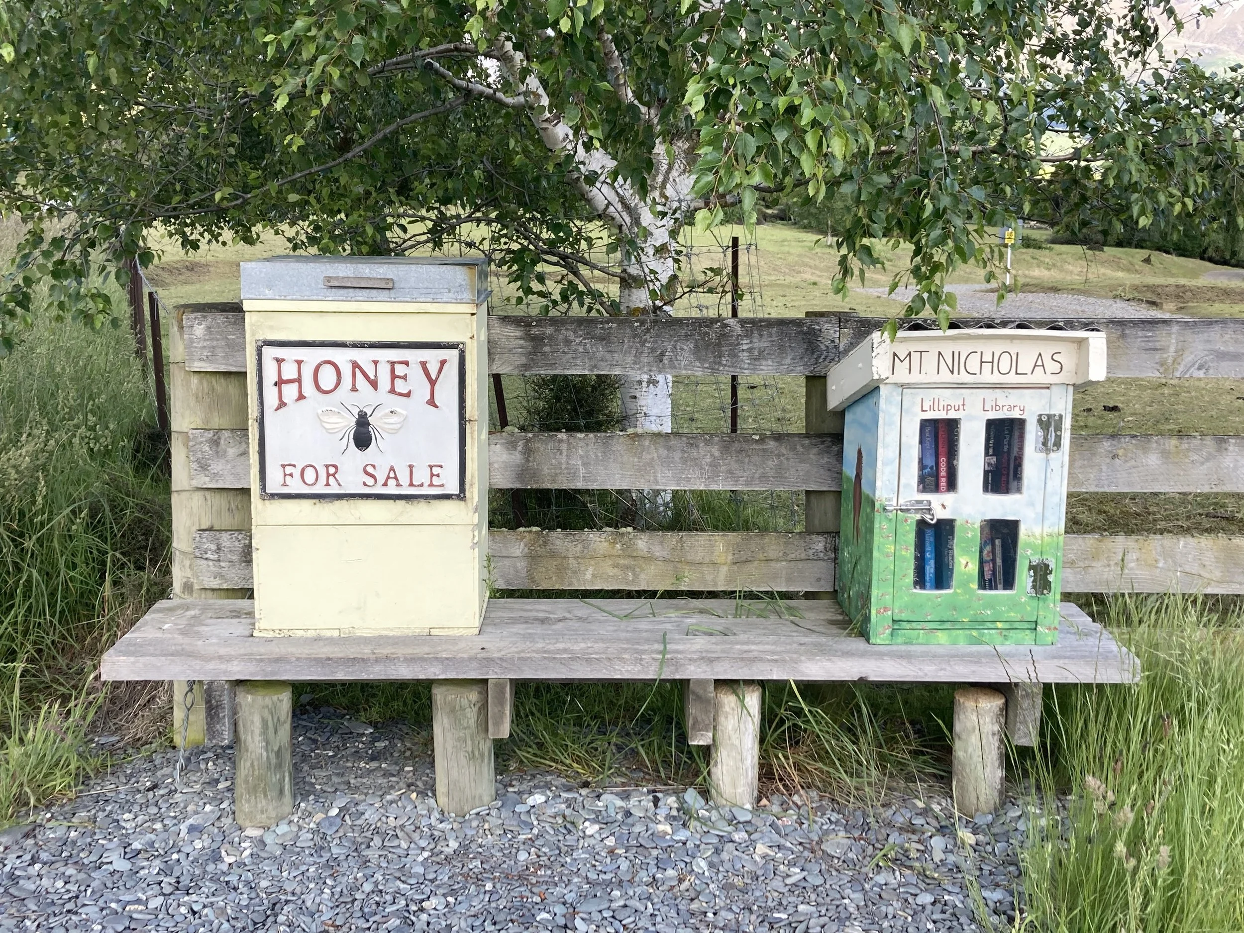 From left to right: Nicely sunlit scenery, all together to keep it simple. Book swap, and honey for sale. More hazards going into the back country. The road ahead. Stuck behind some slow traffic.