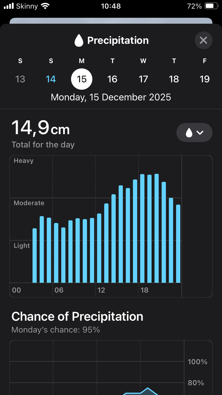 There’s been a day of wet weather in the forecast coming up for about a week. It arrives tomorrow, and it's so rainy there's an Orange rain warning for it. That extends from 10am today, through to 2am tomorrow morning. Not weather to cycle in.