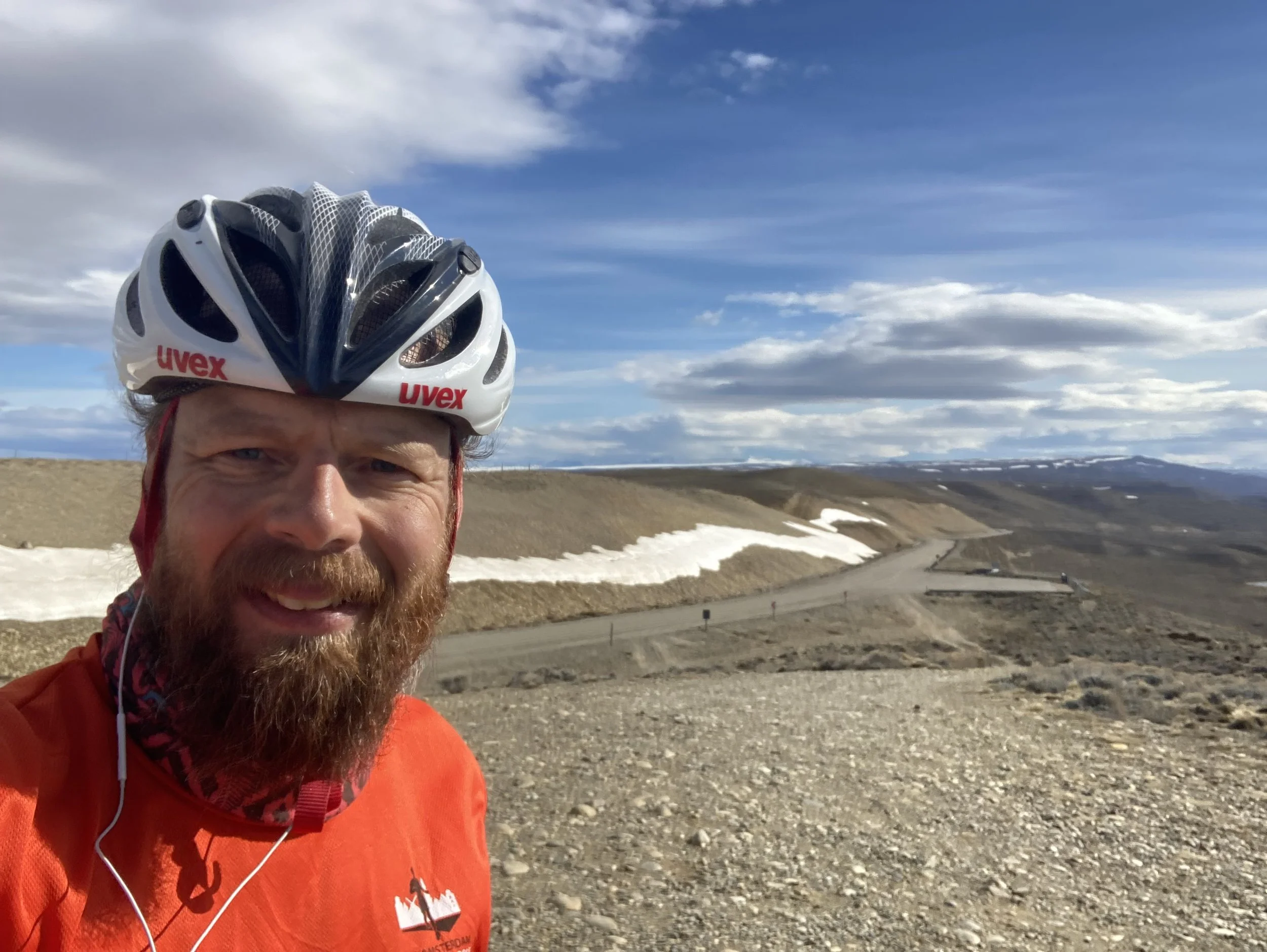 1630: Reach the peak! The view is spectacular. There's a long descent but the headwind is so strong that I don't get up much speed, and don't even need to use the brakes.